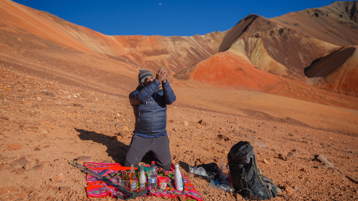 We hike first to a plateau where Alvaro spreads a blanket, sinks to his knees and performs a Pawa – an Aymara ceremony to thank Pachamama with food and drink.