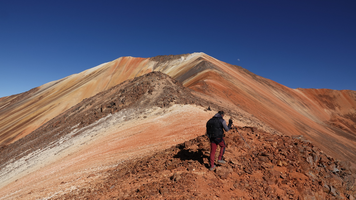 When we begin climbing again, I go slowly up one spine of the volcano, not just for safety, but to memorize the regal hues; burnished gold, white silver and red copper.